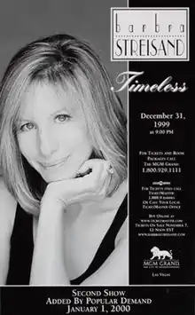 Timeless[2] was a concert tour by entertainer Barbra Streisand. Following her hotly anticipated Millennium Concert 1999/2000 (which is cited as being part of this tour) Barbra decided to take this concert on the road for an 8-day tour of Australia, Los Angeles & New York.[3] The tour grossed a record-breaking $70 million and drew audiences of 200,000 for only 10 dates.
