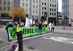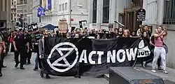 Extinction Rebellion (XR), a 2018 UK-founded environmental movement,[1][2] has since spread to the rest of Europe, the United States, and other countries, forming an international "non-violent civil disobedience" movement through mass protest.[3] XR carries out demonstrations to highlight governments' inaction on climate change. Since 2018, Extinction Rebellion has taken a variety of actions in Europe, the US, and elsewhere in the world, to urge political and economic forces to take action amid the climate crisis. Although, their non-violent disobedience protests are an effort to generate attention around environmental issues, XR activists have become known for civil disobedience and disruptive tactics.[4]