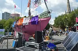 On 13 and 14 July a weekend of protest was held in East London, with a series of seven-minute Dalston traffic blockades, a mass bike ride through the A10, Olympic park traffic blocks, a people's assembly outside Hackney Town Hall, and all-day talks and panels in London Fields.[94] This was the predecessor to a "Summer Uprising" from 08:00 on 15 July to 11:00 on 20 July, in Bristol, Leeds, Cardiff, Glasgow and London. Protests in the different cities focused on different threats: rising sea levels, floods, wildfires, crop failures and extreme weather, with a different coloured boat marked "Act Now" and other messages in each location.[95] There was significant disruption to traffic in protest locations.[96]