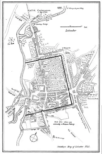 - The gradually Romanising settlement of Ratae Corieltauvorum (meaning Ramparts of the Corieltauvi) was recognised as the Corieltauvi's Civitas Capital.[15] The plural conjugation of the name Ratae might have either referred to the different sided ramparts of a single oppidum or to the ramparts of several oppida surrounding the main one excavated east of the River Soar.[16]