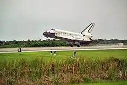 Atmospheric reentry and landing at Kennedy Space Center's Shuttle Landing Facility.