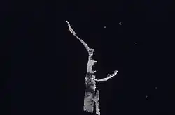 About 23 minutes into the flight, further debris was observed floating beside the orbiter as reported by Mission Specialist Michael Fossum. His transmission was broadcast live on NASA TV. Fossum initially described the debris as a 4–5-foot-long piece (1.2–1.5 m) with straps attached, a description which would fit a thermal protection system blanket. Such a blanket was noted to be flapping on the previous mission, STS-114, but was not of concern as it protects a section of the vehicle which does not get particularly hot. Analysis of video images on the ground has indicated that the debris observed was strips of ice formed on the outside of an engine nozzle, which sublimated and disintegrated during observation. Very similar ice formations were seen on earlier missions.