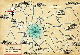 | 500 BC (Approx.)[5] | The ancient settlement of Ufẹ (Ife) was founded in this time period or earlier.[6] It started out as a group of tiny hamlets or 'house societies' in a swampy depression surrounded by hills in the heart of the Nigerian lowland forests like its contemporary societies across Yorubaland emerging at about the same period. Ife would however grow to become the Yoruba premier city[7] and one of Africa's most impactful states through the spreading of its systems of monarchy, society, culture and religion by way of kingdom founding migrations,[5] forming societal nuclei throughout the regions between the lower Niger and Volta rivers.[8][9] | |