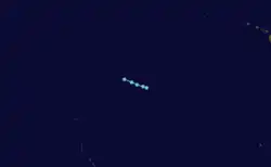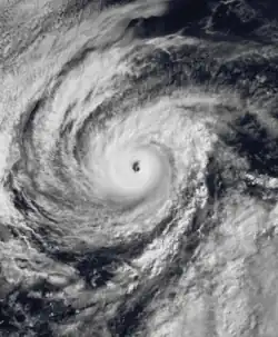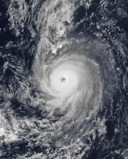 A tropical disturbance developed about 180 mi (290 km) south of the Guatemala coastline. After developing a circulation, the system was upgraded into a tropical depression on July 27. Moving west-northwest, the depression strengthened into Tropical Storm Henriette at 1800 UTC that day.[7] Henriette continued to deepen, and by late on July 28, the storm attained winds of 65 mph (105 km/h).[3] Although initially expected to pose a threat to Hawaii,[17] this did not occur. It rapidly intensified,[3] and late on July 28, the EPHC upgraded the storm into a hurricane. While turning west-southwest on a track similar to Gil's,[7] it attained Category 2 intensity on July 29. At 0000 UTC on July 30, Henriette was upgraded into a Category 3 hurricane. After leveling off in intensity,[3] the storm passed within 70 mi (115 km) within Clipperton Island.[7] Hurricane Henriette attained its peak intensity early on July 31, with winds of 130 mph (215 km/h), a Category 4 system.[3] At peak, Henriette displayed a well-defined eye.[7]