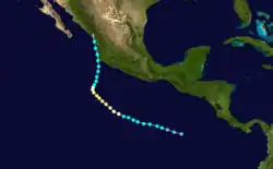 The origins of Hurricane Ismael were from a northward bulge of the Intertropical Convergence Zone (ITCZ) in early August, which resulted in the formation of a tropical depression on August 8. Six hours later, it was upgraded into Tropical storm Ismael. Continuing to intensity, Ismael was upgraded into a hurricane late on August 10 and subsequently developed an eye. The storm soon reached its peak of 100 mph (155 km/h). Late on August 11, Hurricane Ismael began to weaken as it encountered cooler waters and the hurricane was soon downgraded to a Category 1 on the SSHWS. The following day, Ismael was downgraded into a tropical storm about 380 mi (610 km) west of the Baja California peninsula. On August 14, the storm was downgraded into a tropical depression while centered about 250 mi (400 km) west of Point Ensenada.[7] Ismael dissipated that day.[3]