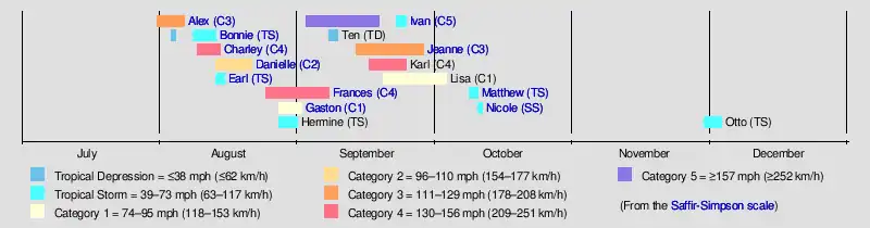 This season had 16 tropical depressions, of which, 15 became named storms. Of these, 9 strengthened into hurricanes with 6 intensifying into major hurricanes.[nb 1] The most noteworthy storms for the season were the five named storms that made landfall in the U.S. states of Florida and Alabama, three of them with at least 115 mph (185 km/h) sustained winds (major hurricane strength): Tropical Storm Bonnie, Charley, Frances, Ivan, and Jeanne. This is the only time in recorded history that four hurricanes affected the U.S. State of Florida although one of the four, Ivan, brought hurricane-force winds to the state without making a landfall there.[2]