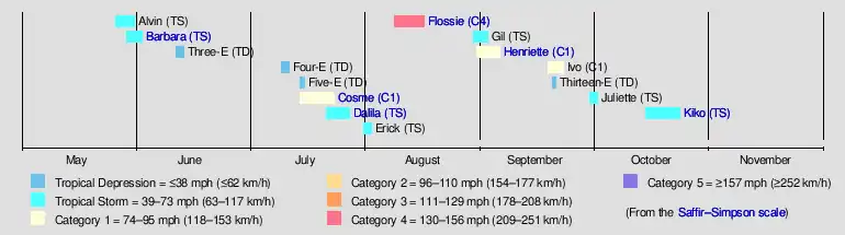 The season officially started on May 15, 2007, in the eastern Pacific, designated as the area east of 140°W, and on June 1, 2007, in the central Pacific, which is between the International Date Line and 140°W, and lasted until November 30, 2007. These dates conventionally delimit the period of each year when most tropical cyclones form in the Pacific basin. The season began slowly; through the end of July, the seasonal Accumulated Cyclone Energy (ACE) was the third lowest since the geostationary satellite era began in the 1966 Pacific hurricane season.[1] The inactivity continued through the next month, which was the third quietest August in terms of ACE since reliable records began in the basin during the 1971 Pacific hurricane season.[2] In June, Tropical Storm Barbara caused $55 million (2007 USD) in crop damage to southeastern Mexico from heavy precipitation.[3] In August, Hurricane Flossie formed in the eastern Pacific and crossed into the central Pacific; the hurricane threatened Hawaii but caused little damage. In early September, Hurricane Henriette dropped heavy rainfall in southwest Mexico, which caused nine fatalities and $25 million (2007 USD) in damage.[4]