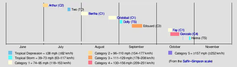 Altogether, eight tropical storms formed during the season, including six hurricanes of which two intensified into major hurricanes.[nb 2] There was also one tropical depression that failed to reach tropical storm strength. Impact throughout the year was widespread. Arthur, which made landfall near Cape Lookout, North Carolina on July 3, with 100 mph (155 km/h) winds, was the strongest hurricane to strike the U.S. mainland since Hurricane Ike in 2008 (with 110 mph (175 km/h) winds).[2] The deadliest Atlantic storm of the season, Cristobal, barely touched land at all as it moved from Puerto Rico to Iceland in late August. Even so, it was responsible for at least seven fatalities: four on Hispaniola, one on Providenciales, and two along the U.S. East Coast.[2] In October, Bermuda was struck twice, as hurricanes Fay and Gonzalo made landfall only six days apart (October 12 and 18 respectively), leaving much damage in their wakes.[2]