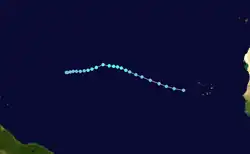 By convention, meteorologists use one time zone when issuing forecasts and making observations: Coordinated Universal Time (UTC), and also use the 24-hour clock (where 00:00 = midnight UTC).[4] The National Hurricane Center uses both UTC and the time zone where the center of the tropical cyclone is currently located. The time zones utilized (east to west) are: Greenwich, Cape Verde, Atlantic, Eastern, and Central.[5] In this timeline, all information is listed by UTC first, with the respective regional time zone included in parentheses. Additionally, figures for maximum sustained winds and position estimates are rounded to the nearest 5 units (knots, miles, or kilometers), following National Hurricane Center practice. Direct wind observations are rounded to the nearest whole number. Atmospheric pressures are listed to the nearest millibar and nearest hundredth of an inch of mercury.