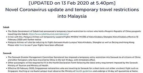 On 10 February, the Sarawak Disaster Management Committee prohibited entry by Singaporeans due to a major increase of positive cases in the neighbouring country.[34] That same day, the total number of cases rose to 18. The latest case was a Malaysian citizen who had recently traveled to China.[35][36]