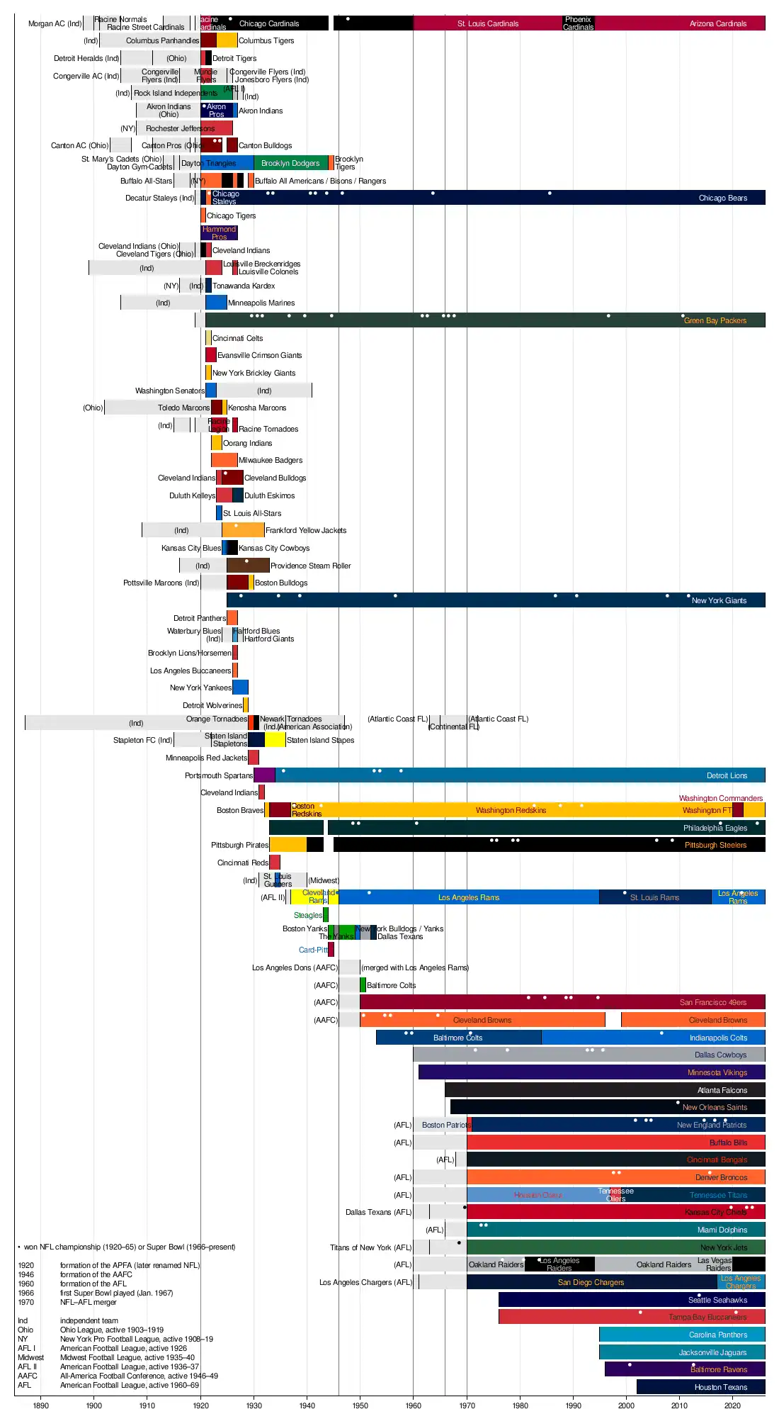 This timeline of the National Football League (NFL) tracks the history of each of the league's 32 current franchises from the early days of the league, through its merger with the American Football League (AFL). The history of franchises that began as independent teams, or as members of the Ohio League, New York Pro Football League, and other defunct leagues are shown as well.