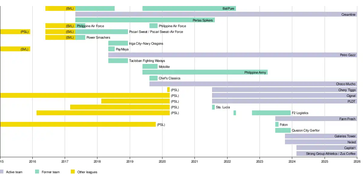 The Premier Volleyball League (PVL) was established in 2017 as a rebranding of the former Shakey's V-League (SVL). As of 2025, the PVL is composed of twelve active member teams.