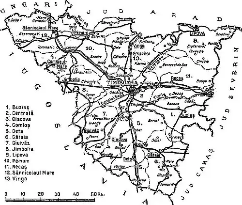 Administratively, Timiș-Torontal County was originally divided into ten districts (plăși):[2]