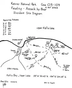 In October 2003, Treadwell and his girlfriend, physician assistant Amie Huguenard (born October 23, 1965, in Buffalo, New York), visited Katmai National Park, which is on the Alaska Peninsula across Shelikof Strait from Kodiak Island. In Grizzly Man, Werner Herzog states that Treadwell had written in his diaries that Huguenard feared bears and felt very uncomfortable in their presence. Her final journal entries indicated that she wanted to be away from Katmai.[12] Treadwell set his campsite near a salmon stream where wild bears commonly feed in autumn. He was in the park later in the year than normal,[4] at a time when bears attempt to gain as much fat as possible before winter. Food was scarce that autumn, causing the bears to be even more aggressive than usual.[1][13]