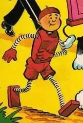 A few years later came the addition of a clockwork sister called Babe, a pet cat called Clanky, and a horse called Ironsides.[1] The strip was created by the Italian Dinelli brothers, but they disappeared in France at the start of World War II.[2] The strip was taken over by one of DC Thomson's own artists after issue 69 with new strips being drawn by Sam Fair, Charles Gordon and George Drysdale.[3] The strip continued until issue No 303 in 1947.