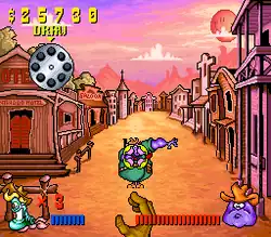 Tin Star is an arcade-style[3] shoot 'em up game.[4][5] It is compatible with the standard Super Nintendo Entertainment System (SNES) controller, the Super Scope, and the SNES Mouse,[6][7][2] and is the first SNES game to be playable with all controllers.[8] From Monday[9] to Sunday,[10] each day consists of shooting practice with a jug, action stages, and a fast draw with a Bad Oil Gang member.[11] The game has 31 levels, unusual for a shoot 'em up game at the time.[8]