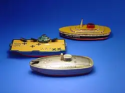 Tinplate was used in the manufacture of toys beginning in the mid-19th century. The invention of sheet metal stamping machines in 1815 allowed for the mass production of inexpensive toys. Tin toys were made from thin sheets of steel plated with tin, hence the name tinplate.[2] Tin toys were a cheap and durable substitute for wooden toys. The toys were originally assembled and painted by hand. Spring-activated tin toys originated in Germany in the 1850s.[3] In the late 1880s offset lithography was used to print designs on tinplate. After the colorful designs were printed on the metal, they were formed by dies and assembled with small tabs. The lightweight nature of the toys allowed them to be shipped less expensively and easier than the heavier cast iron toys.