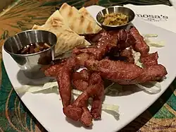 The beef strips are commonly seasoned with a mixture of salt, black pepper, and garlic.[1] Soy sauce and vinegar can also be used.[5] The beef strips are marinated in the mixture.[5][6] Then they are dried using an oven, a fire, or left out to hang for a few days or in the sun.[1][5][6] The traditional method is letting it dry in the sun.[5] Prior to serving, the tinala' katne can be heated on a grill or in the oven.[2]