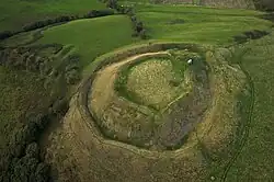 The site of Tinboeth Castle is located around 11 miles (18 km) from Llandrindod Wells between the villages of Llanbister and Llanbadarn Frynydd.[2] The castle lies on the bank of the River Ithon.[3] The castle was constructed in an Iron Age hillfort and measures around 100 metres (330 ft) in diameter.[3][4] The Royal Commission on the Ancient and Historical Monuments of Wales notes that the remains indicate the site featured a twin-towered gatehouse on the north-east corner of the structure.[4]