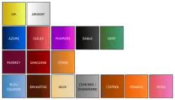 A diagram of various tinctures in heraldry:First row: Metals; Second row: Colours; Third row: Stains; Fourth row: Nontraditional tinctures