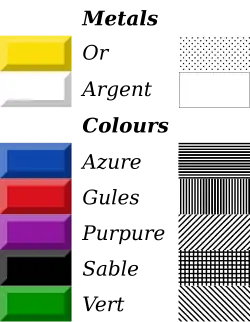 The metals are or and argent, representing gold and silver respectively, although in practice they are often depicted as yellow and white.[12][13]