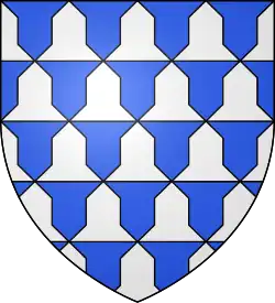 Vair (Ger. Feh) derives its name from Latin varius, "variegated". It is usually depicted as a series of alternating shapes, conventionally known as panes or "vair bells", of argent and azure, arranged in horizontal rows, so that the panes of one tincture form the upper part of the row, while those of the opposite tincture are on the bottom. Succeeding rows are staggered, so that the bases of the panes making up each row are opposite those of the other tincture in the rows above and below. As with ermine, the argent panes may be depicted as either white or silver; silver is used more often with vair than with ermine, but the natural fur is white.[22][23]
