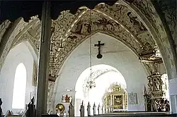 The frescos in the chancel and the nave from the late 15th century are the work of the Elmelunde Master[5] and his workshop. Rediscovered under the whitewash in 1877, they depict the baptism of Jesus, the suicide of Judas, the rich man and the poor man together with the Fall and the Expulsion. The rich man, kneeling before Christ, wears a long-tailed hood, an article of clothing reserved for the more affluent of the time.[6]