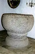 The panel on the 17th-century altar is the work of Antonius Clement, Queen Sophia's court painter. Its three niches have female figures representing Faith, Hope and Charity and are bordered by slim figures representing the cardinal virtues: Temperance, Justice, Prudence and Fortitude. The elaborately worked Renaissance altarpiece (1616) contains a painting of the Last Supper. The carved baroque pulpit (1633) by Jørgen Ringnis with paintings by Anthonius Clement bears similarities to the one in Kippinge Church. The Romanesque font has a wide, rounded bowl.[1][4]