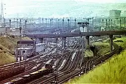 The Manchester-Sheffield-Wath electrification was extended into the yard in 1965[5] to allow electrically hauled trains to the Manchester area to be handled. Seventeen miles of track from Woodburn Junction and Darnall Junction via Broughton Lane to the Reception Sidings at Catcliffe were electrified at 1500 V DC. The insulators were capable of being used at 6.25 kV AC if ever required, with the option of 25 kV AC with minimal conversion costs.[6] Unlike similar electrified marshalling yards, to save on costs the main body of the sorting sidings was not electrified: a half of the arrival sidings was electrified for incoming electric trains; departing electric trains either had to use the southern third of the main sorting sidings (the western part of which were wired for electric trains) or had to be drawn out of the main sorting sidings by diesel locomotives into electrified departure roads where the electric locomotives were attached.