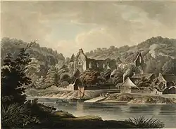 Not all visitors to the Abbey ruins were shocked by the intrusion of industry, however. Joseph Cottle and Robert Southey set out to view the ironworks at midnight on their 1795 tour,[26] while others painted or sketched them during the following years.[27] A 1799 print of the Abbey by Edward Dayes includes the boat landing near the ruins with the square-sailed local cargo vessel known as a trow drawn up there. On the bank is some of the encroaching housing, while in the background above are the cliffs of a lime quarry and smoke rising from the kiln. Though Philip James de Loutherbourg's 1805 painting of the ruins does not include the intrusive buildings commented on by others, it makes their inhabitants and animals a prominent feature. Even William Havell's panorama of the valley from the south pictures smoke rising in the distance (see Gallery), much as Wordsworth had noted five years before "wreathes of smoke sent up in silence from among the trees" in his description of the scene.[28]