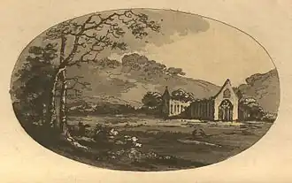 Another visitor during the 1770s was the Rev. William Gilpin, who later published a record of his tour in Observations on the River Wye (1782),[34] devoting several pages to the Abbey as well as including his own sketches of both a near and a far view of the ruins. Though he too noted the same points as had Grose, and despite also the presence of the impoverished residents and their desolate dwellings, he found the Abbey nevertheless "a very inchanting piece of ruin". Gilpin's book helped increase the popularity of the already established Wye tour and gave travellers the aesthetic tools by which to interpret their experience. It also encouraged "its associated activities of amateur sketching and painting" and the writing of other travel journals of such tours. Initially Gilpin's book was associated with his theory of the Picturesque, but later some of this was modified by another editor so that, as Thomas Dudley Fosbroke’s Gilpin on the Wye (1818), the account of the tour could function as the standard guidebook for much of the new century.[35]