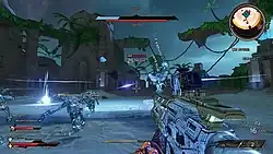 Similar to its predecessors, the game is a first-person shooter with elements of an action role-playing game. The game can be played solo or with up to three other players in online or local split-screen multiplayer. The game is set within the world of a fantasy-themed tabletop role-playing game.[3] The game features an overworld, which is used by the playable characters to traverse the various locations in the game. There are random combat encounters and quests that can only be completed in the overworld.[4][5]
