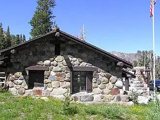 The Tioga Pass Entrance Station is the primary entrance for travelers entering Yosemite National Park from the east on the Tioga Pass Road. Open only during the summer months, the entrance station consists of two historical buildings, a ranger station and a comfort station, built in 1931 and 1934 respectively. Both are rustic stone structures with peeled log roof structures, and are examples of the National Park Service rustic style employed at the time by the National Park Service. Two log gate structures that had been removed since the site's original construction were rebuilt in 1999;[2] the stone piers that supported them remain. The use of stone at Tioga Pass set a precedent for the extensive employment of stone construction in other park buildings in the Yosemite high country. Civilian Conservation Corps workers assisted in the entrance station's construction.[3]