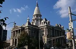 When the county was first organized in 1826, rooms were rented in which to conduct county business, until 1829 when the first courthouse was built; it was a two-story brick building. It was replaced by a larger brick building in 1845 at a cost of about $3,000; there was a fire in this building in the 1840s, but it was extinguished before it could do any damage. The third and current courthouse was built on the site from 1881 to 1884 at a cost of about $500,000.[2] It is built of Indiana limestone and is two-and-a-half stories tall on a raised basement. Architecturally, it is a pastiche of styles including Second Empire, Beaux Arts, Baroque, Rococo, Georgian and Neo-Classical. Paul Goeldner in his study of Midwestern courthouses called the building the "epitome of county capitals".[3]