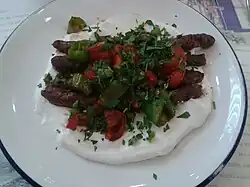 Tire meatballs, which are peculiar to the Tire district of İzmir Province, Turkey, are grilled with a thickness of a pen on thin skewers.[1][2] No spices other than salt are used in its minced meat; and the meatballs are served with a buttery tomato sauce. The essential taste of Tire meatballs is revealed by the village butter used in its sauce. These meatballs, also known as Delikli (drilled) meatballs and Tire Kebab in the public are served by putting fresh parsley on them. Optionally, Tire meatballs may also be served with yoghurt.[3][4]
