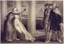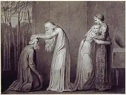Tiriel is a narrative poem by William Blake, written c.1789. Considered the first of his prophetic books, it is also the first poem in which Blake used free septenaries, which he would go on to use in much of his later verse. Tiriel was unpublished during Blake's lifetime and remained so until 1874, when it appeared in William Michael Rossetti's Poetical Works of William Blake.[1] Although Blake did not engrave the poem, he did make twelve sepia drawings to accompany the rough and unfinished manuscript. However, three of them are considered lost as they have not been traced since 1863.[2]
