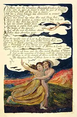Other aspects of Blake's mythology also begin to emerge during the poem. For example, Damon argues that the death of the four unnamed daughters and the corruption of the fifth is Blake's first presentation of the death of the four senses and the corruption of touch, or sex; "all imaginative activity based on the senses disappears except automatic sexual reproduction. Even this proves too much for his moral virtue."[39] As Damon elaborates, "Hela's Medusan locks are the torturing thoughts of suppressed lust."[40] The corruption of the senses plays an important role throughout Europe a Prophecy ("the five senses whelm'd/In deluge o'er the earth-born man"), The Book of Urizen ("The senses inwards rush'd shrinking,/Beneath the dark net of infection"), The Song of Los ("Thus the terrible race of Los & Enitharmon gave/Laws & Religions to the sons of Har binding them more/And more to Earth: closing and restraining:/Till a Philosophy of Five Senses was complete"), The Four Zoas ("Beyond the bounds of their own self their senses cannot penetrate") and Jerusalem ("As the Senses of Men shrink together under the Knife of flint").