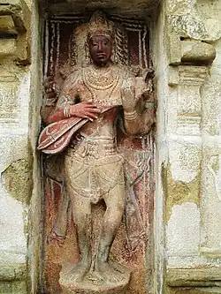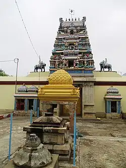 Adhimooleswarar temple complex has two prakarams (outer courtyard) and a small five-tiered rajagopuram (gateway tower). The central shrine faces east and holds the image of Adhimooleswarar (Shiva) in the form of a granite lingam. The granite images of the deities Ganesha (son of Shiva and god of wisdom), Murugan (son of Shiva and god of war), Nandi (the bull and vehicle of Shiva), and Navagraha (nine planetary deities) are located in the hall leading to the sanctum. The hall leading to the sanctum also has the South facing shrine of Nithyakalyani (Parvati), the consort of Adhimooleswarar, in standing posture. As in other Shiva temples of Tamil Nadu, the first precinct or the walls around the sanctum have images of Dakshinamurthy (Shiva as the Teacher), Durga (warrior-goddess), and Chandikeswarar (a saint and devotee of Shiva). There are also images of Bhikshatana, Dakshinamurthy sporting a Veena, and Vishnu. The first precinct is surrounded by granite walls.[2]