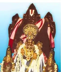 The presiding deity is Narasimhar (also called Mukunda Nayaka) is depicted in a seated posture facing West.[1] The temple is located close to the Tiruththanka temple in Vishnu Kanchipuram. The temple has three shrines, one each for the presiding deity Aḻagiya Singar, one for his consort Amruthavalli and other for Garuda.[3]