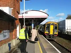 South Western Railway operate hourly throughout most of the week between Exeter St Davids, Tisbury, Salisbury and London Waterloo station, although extra trains run in peak hours. Trains are timetabled to pass in the loop to the east of the station.[4] Due to the short platform, passengers wishing to alight need to be in the front 3 coaches of the train as the platform can only take 3-car trains.[5]
