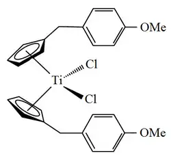 Titanocene Y also known as bis[(p-methoxybenzyl)cyclopentadienyl]titanium(IV) dichloride or dichloridobis(η5-(p-methoxybenzyl)cyclopentadienyl)titanium is an organotitanium compound that has been investigated for use as an anticancer drug.[1]