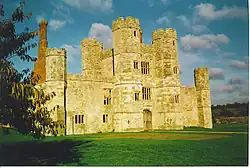 Unlike his similar project at Beaulieu Abbey, which he had also been granted by King Henry, Wriothesley chose to convert the main abbey buildings, including the church, into his house. It was an imaginative scheme, built under the direction of master mason Thomas Bartewe, a prominent contractor for King Henry's contemporary fortification works along the South Coast.[15] He constructed a spectacular castellated gatehouse with four octagonal turrets which was forced through the middle of the nave to provide the appropriate seigneurial emphasis needed for a classic Tudor courtyard house.[17] The cloister became the central courtyard of the house (a magnificent fountain was placed in the middle), the old refectory, with the addition of a grand porch, became the great hall, while the rest of the abbey was turned into fine apartments for the family. The church tower was initially kept as part of the house but it was soon demolished on the advice of John Crayford, one of the king's commissioners who helped to oversee the reconstruction on behalf of Wriothesley. Crayford was anxious to see the tower pulled down as, if it was left standing, the chimneys would have to be raised some twenty feet higher - and at great cost - to avoid defacing the church tower with their smoke.[16] Other features of the mansion included a private indoor theatre and a deer park.[6][18]