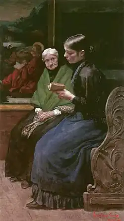 Notable paintings include Boy with Cherries (1894), Creekside with Mackerel-sky (1894), The Poor Woman´s Home (1895), Returning Home (1897–98) and Holiday (1899). His 1889 painting, In the Church, was exhibited at the 1900 Exposition Universelle in Paris.[8] He exhibited at the 1901,[9] 1905,[10] and 1909[11] Venice Biennales; and in London in 1908.[12] His work is included in the collections of the Budapest National Gallery.[13]
