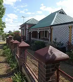 The southern and eastern sides of the property are surrounded by an original low brick wall including an original decorative single iron gate displaying the name "To-Me-Ree" fronting Macalister Street which leads to the front verandah steps.[1]