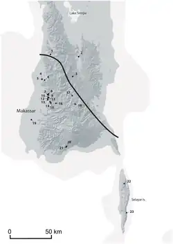 The earliest peopling of Sulawesi is considered to be related to a wave of migration through Indonesia around 45 thousand years ago, during which some people remained in the area while others continued on to eventually reach Sahul.[11] A number of related Pleistocene sites in the area are known for their rockart.[12][13] These sites predate the Toalean culture, and an absence of archaeological sites dated to the intervening period between 12-8kya prevent a direct link.