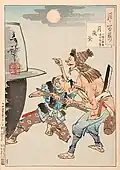 ![]() ![]() ![]() ![]() ![]() Clockwise from top left: Tsukiyo no Kama by Tsukioka Yoshitoshi (1886); An excerpt form Kokonobake no uchi by Toyokawa Yoshikuni (1825); Okame under mosquito netting by Keisai Eisen (c. 1810); Fukubiki subject by Keisai Eisen (c. 1810); Act VIII, from the series The Storehouse of Loyal Retainers by Utagawa Hiroshige I (1835) | |