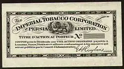 On 20 March 1890, Emperor Naser al-Din granted a concession to Major G. F. Talbot for a full monopoly over the production, sale, and export of tobacco for fifty years. In exchange, Talbot paid the emperor an annual sum of £15,000 (present-day £1.845 million; $2.35 million) in addition to a quarter of the yearly profits after the payment of all expenses and a dividend of five percent on the capital. By the fall of 1890, the concession had been sold to the Imperial Tobacco Corporation of Persia, a company which some have speculated was essentially Talbot himself as he heavily promoted shares in the corporation.[5] At the time of the concession, the tobacco crop was valuable not only because of the domestic market but because Iranians cultivated a variety of tobacco "much prized in foreign markets" that was not grown elsewhere.[6] The Tobacco Régie (monopoly) was subsequently established and all the producers and owners of tobacco in the Qajar Empire were forced to sell their goods to agents of the Régie, who would then resell the purchased tobacco at a price that was mutually agreed upon by the company and the sellers with disputes settled by compulsory arbitration.[6]