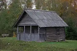 Tobrova tsässon is a small fir wood cross-beam building that has a square floor plan; it is connected by fishtail tenons in the corner. Corner tenons are axe-hewn; the walls of the building have also been hewn from the inside. Some of the wall beams have been replaced by newer ones: the lower log row in the entire building, two lower beams on the north-east side and two lower beams on the northern corner. The wall beams of the building in the corners and in the middle of the wall are standing on granite stones. The dimensions of the tsässon are 508 x 332 cm; the building has one interior room (12.3 m2) and an outer shelter of 2.3 m2. The entrance-room has square beam posts and a vertical boarding barrier. The supporting posts and barrier of the entrance-room has been replaced a few decades ago; a bit earlier, wider, sawn, vertical boards fixed side-by-side were used at the lower part of the barrier. Back then, the posts were axe-hewn square beams. The ceiling of the tsässon is finished by wide boarding, hammered to the rafters and forming a roof-ceiling. There are no ceiling-beams. The building stands on granite stones. The height of the wall from the ground up to where the rafters are attached is 188 cm and the height up to the ridge is 366 cm. The photos of 1974 and 1980 show that the building had a shingle roof that was in good condition, and now has eternit sheets on top of it. The ridge has a simple forged cross on it. A faded entry icon is under the eaves. The floor is made from hand hewn and dressed boards. The building has a door (92 x 146 cm) made from boards fixed on the crosspiece and attached on the hewn tender posts. Forged hinges with tips resembling bird heads are on the door. From the inside, the door does not have a finishing; sheeting with fishtail fluting is hammered on the outside. There is an alms box outside next to the door. The eastern side of the building has a wooden window with a single frame and three panes. The window with a trapdoor opens on the inside. The building has been inventoried during 1974. Fr. Dr. Fr. R. Kreutzwald Memorial Museum expedition. A photo was taken of the tsässon and icons and an inventory record was drawn up where the structure of the building and the icons were described. Tobrova tsässon is said to be one of the best preserved tsässon in Meremäe rural municipality on the inventory record (Kupp 1974). The outer look of the tsässon has not changed much compared to 1974.[1]