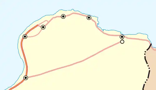The road has shortened the distance between Tobruk and Ajdabiya to about 410 km (256 mi), from 610 km (388 mi) via the Libyan Coastal Highway (Via Balbia). However, the traffic on the road is negligible.