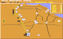 The main display map of the game is focused on Cyrenaica, a representation of the Allied minefield that was laid in the Gazala Line between Gazala and Bir Hachieim.[1] The Axis troops begin the game on the western side of the line, whilst Allied forces begin the offensive in British Egypt. A command box in the game provides the player with an instant report of a unit or landscape once hovered over; data given on units includes their strength in terms of supply of infantry, provisions, artillery, and the number of moves that unit can make on one turn.[1] Every two turns lasts one in-game day and units are available to enter combat phases once a day is finished.[3]